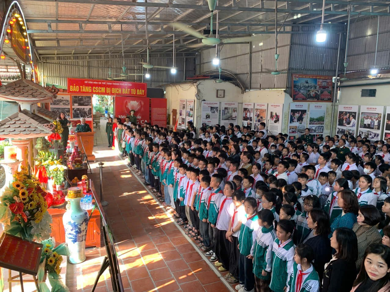 Thầy trò Trường tiểu học Nam Phong đã cùng tham gia giao lưu văn nghệ chào mừng và tri ân. Những lời ca tiếng hát về Bác Hồ, về người chiến sĩ, về quê hương đất nước ngân vang trong khuôn viên bảo tàng.